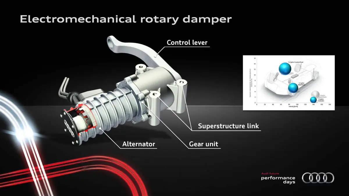 Pour mettre en œuvre ce système, Audi remplace les amortisseurs hydrauliques traditionnels par des amortisseurs électromécaniques. Grâce à une alimentation électrique de 48 volts, ces amortisseurs rotatifs convertissent l’énergie cinétique en électricité.