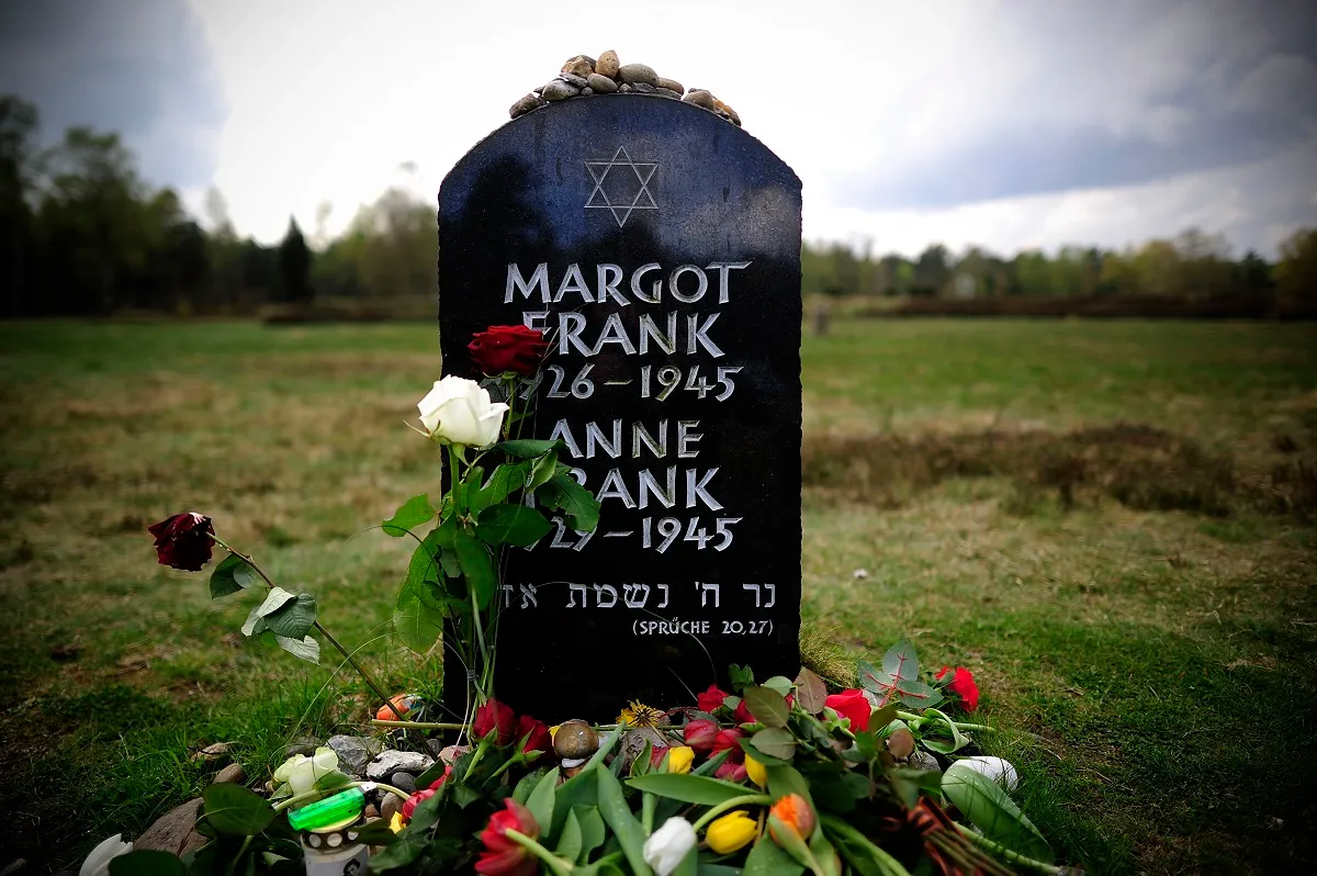 LOHHEIDE, ALLEMAGNE - 26 AVRIL : Des fleurs et des pierres sont déposées sur et devant la pierre tombale de Margot Frank et Anne Frank, lors d'une cérémonie commémorant le 70e anniversaire de la libération du camp de concentration de Bergen-Belsen, à l'ancienne site du camp, le 26 avril 2015 près de Lohheide, en Allemagne. On estime que 70 000 détenus ont perdu la vie aux mains des nazis à Bergen-Belsen durant la Seconde Guerre mondiale, y compris des Juifs et des prisonniers de guerre soviétiques. La plus célèbre de ces victimes est Anne Frank, décédée de la typhoïde à Bergen-Belsen peu avant la libération par les troupes britanniques en avril 1945. (Photo par Alexander Koerner/Getty Images) <em>Image : Alexander Koerner/Getty Images</em>