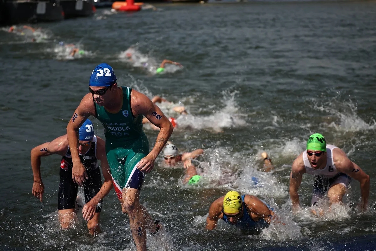 Jamie Riddle, représentant l'Afrique du Sud, participe à l'épreuve de natation lors du triathlon individuel masculin aux Jeux Olympiques de Paris 2024, qui se déroulent dans la Seine au cœur de Paris, le 31 juillet 2024. (Photo par Anne-Christine POUJOULAT / AFP) <em>Image : Anne-Christine POUJOULAT / AFP via Getty Images</em>
